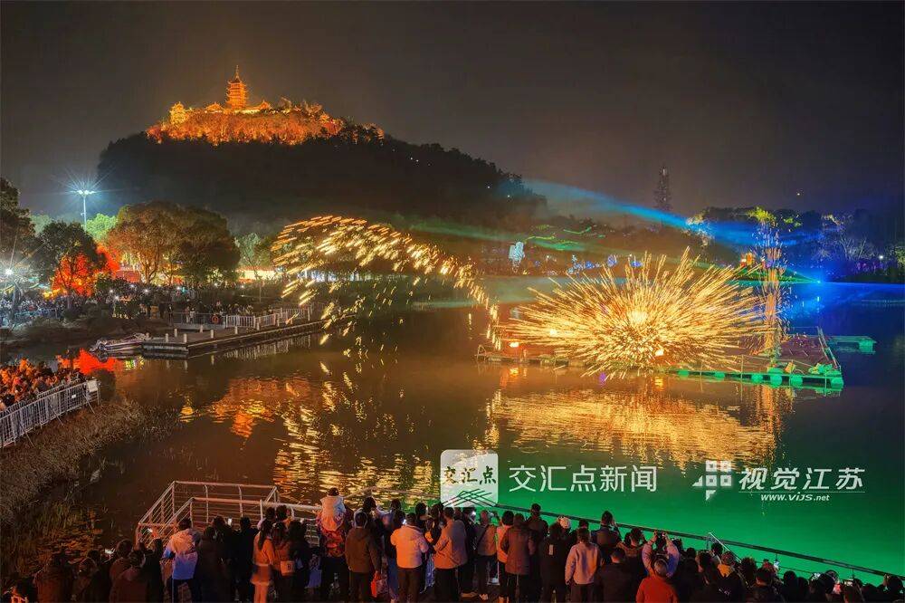 2月19日,旅客正在南通狼山新春灯会上赏灯、旁不雅非遗风俗打铁花、舞龙等,彭岭 摄 视觉江苏网供图
